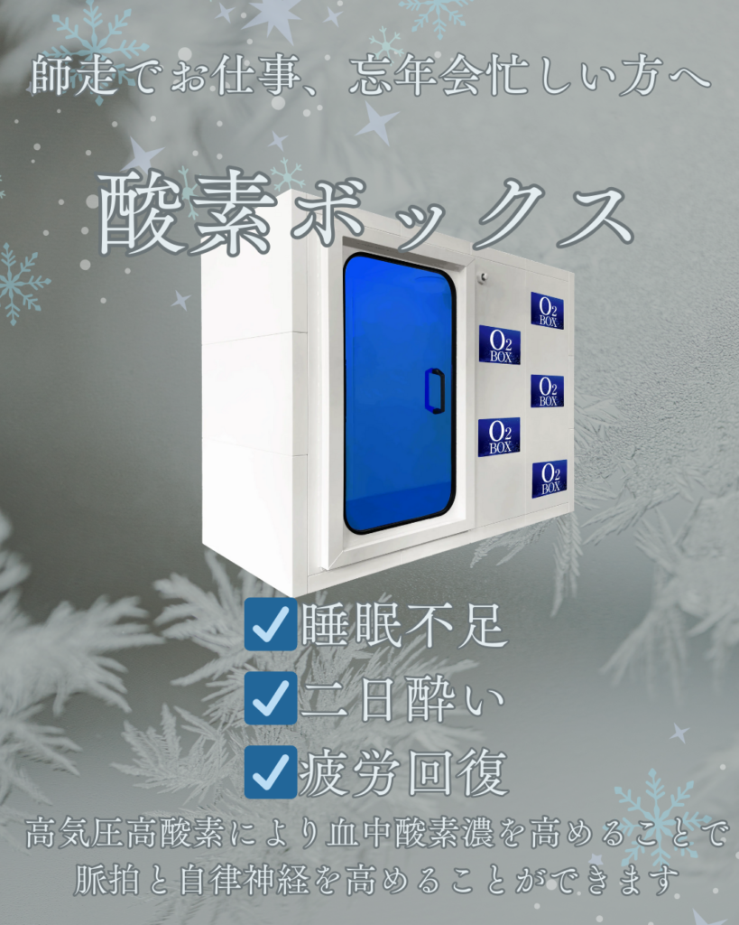 O2BOX内の気圧を高めることで酸素を全身に取り込みやすくなり、疲労回復・睡眠不足・ケガ、故障からの回復・免疫力向上・ダイエット・むくみ・アンチエイジングなど様々な効果が期待できます。